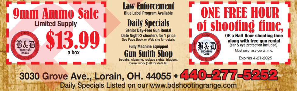 Located in Lorain Ohio, B&D Shooting Range is the number one choice for buying, selling or trading firearms in Lorain County. We offer the highest quality names in firearms, ammunition, optics and shooting accessories.